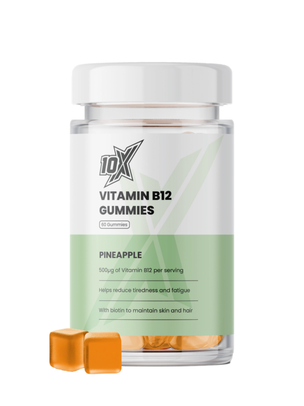 Energy. Focus. Vitality.Each delicious pineapple gummy delivers a high-strength dose of vitamin B12 to support energy metabolism, reduce tiredness, and promote healthy red blood cell formation.Vitamin B12 Supports nervous system health, psychological function, and immune defence.Energy metabolism Helps release energy from food and combat fatigue.Cell division Essential for overall well-being.Perfect for vegans. Naturally flavoured. No artificial colors or preservatives.Suggested Use: For adults only. Consume 2 gummies daily. Do not exceed the recommended dose. Do not use this product instead of a varied and balanced diet. Keep out of the reach of young children.Store in a cool, dry place away from direct sunlight. Suitable for vegans. Check the seal before use.Serving Size: 60 Gummies/30 Servings. Pineapple flavour